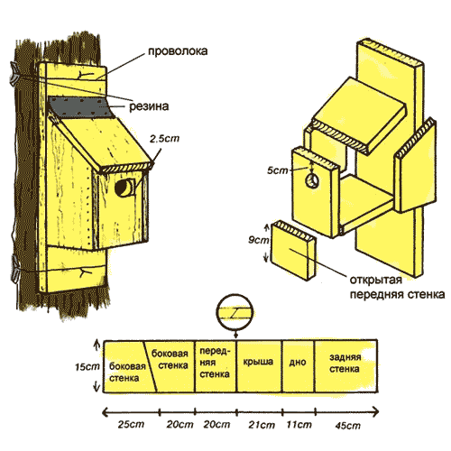 Материал: любые доски (кроме хвойных пород) толщиной не менее 20 мм. Внутренняя поверхность должна быть неровной, желательно с заусенцами и задирами. Не трудитесь, заделывая щели, птицы законопатят их ловчее и надежнее.