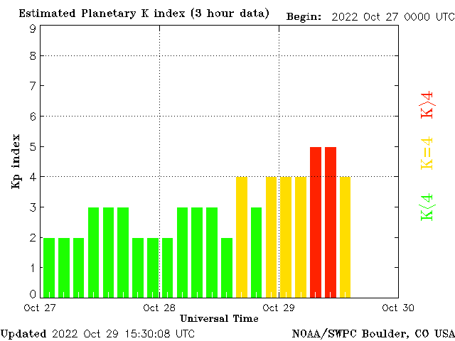 Kp-index характеризует геомагнитное поле в масштабах всей Земли. Kp-index на разных континентах может отличаться на одну или две единицы в ‘ + ‘ или в ‘ — ‘ . Зелёный цвет – безопасный уровень геомагнитной активности. Красный цвет – магнитная буря (Kp-index > 5). Чем выше красная вертикальная линия, тем сильнее магнитная буря. Уровень, начиная с которого вероятны заметные влияния на здоровье метеочувствительных людей Kp-index > 6.