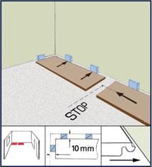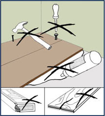 Так как ламинат укладывается плавающим способом, то есть панели ни коем образом не должны быть прикреплены к основанию, соответственно СТРОГО воспрещается жесткое крепление панелей к основанию при помощи гвоздей, шурупов, клея и т.д.