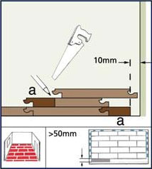 Укладка ламината начинается с формирования первого ряда из 2-ух досок, при этом устанавливаются специальные распорные клинья, обеспечивающие зазор между ламинатом и стеной от 7 до 15 mm. Данные зазоры необходимы для того, чтобы ламинату после укладки не мешала стена расширяться и сужаться. Если Ваш ламинат встал «дыбом», то очень велика вероятность, что нарушено именно это правило. Ламинат укладывается замком на себя для облегчения защелкивания панелей.