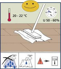 Уборка ламинат осуществляется насухо выжатой тряпкой при комнатной температуре и естественной влажности.