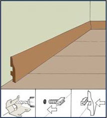 После укладки ламината можно приступать к монтажу плинтуса. Здесь приведена схема крепления плинтуса на клипсах. Обратите внимание — при использовании вентиляционных подложек (Parcolag) нижняя часть плинтуса не должна препятствовать оттоку остаточной влажности стяжки.
